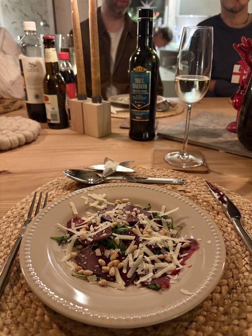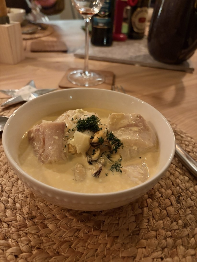 Rencarpaccio till förrätt, fisksoppa till varmrätt och min marängtårta/pinocchiotårta med passionsfruktscreme, blåbär och grädde till efterrätt! En fulländad meny 😍🥳👏