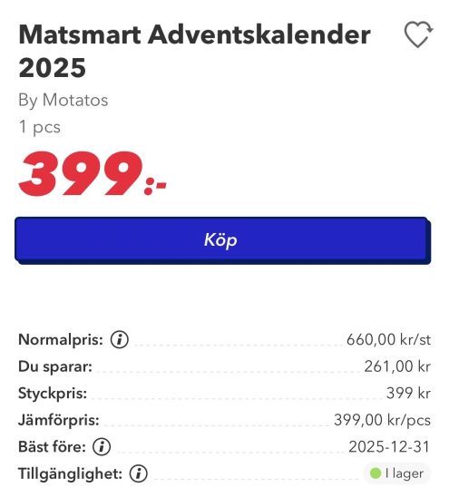 Matsmart har tyvärr ett solklart exempel på prisfusk på deras adventskalender just nu. I oktober lade jag upp ett inlägg om deras adventskalender som kostade 449kr. Nu helt plötsligt står det att den kostar 399kr för att det är ”40% rea” på den och det innebär då att de försöker få en att tro att den kostade 660kr från början!