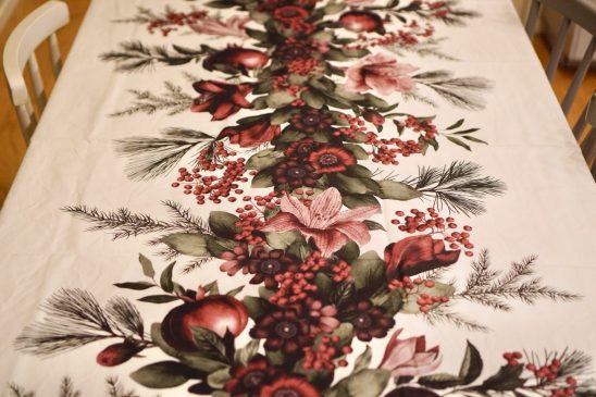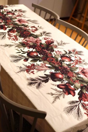 Ser fram emot att använda den!! väldigt dekorativ med alla amaryllisar, tallbarr osv. Tänk er en juldukning med julporslin, silverbestick och fina glas på den…😍